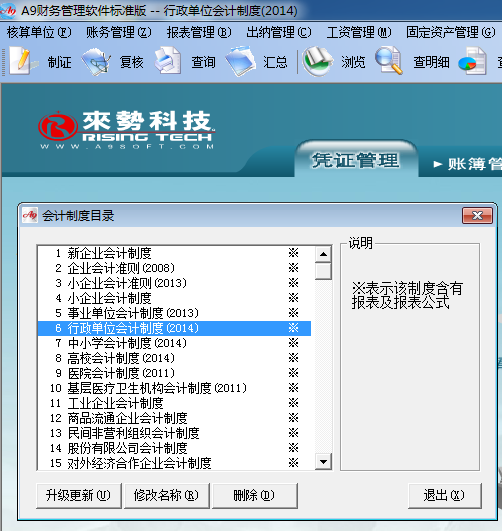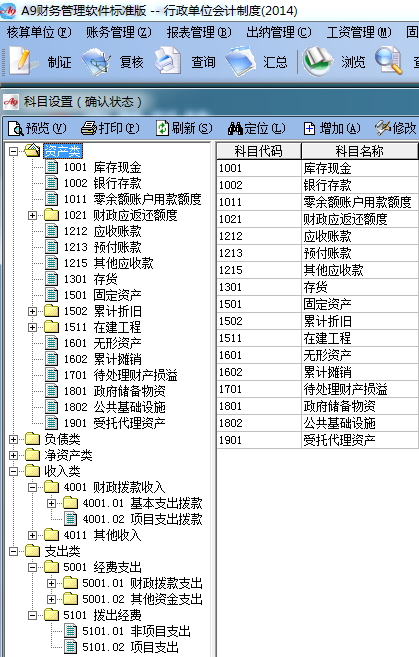為方便廣大用戶能及時用上最新的行政單位會計制度,A9財務管理軟件于2013年底,將該制度的科目,報表設計進軟件中,如圖: