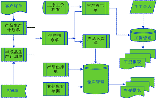 車間完成產品后,要填制產品入庫單,完成產成品和半成品的入庫手續,同時系統會將具體的入庫數據回填到派工單中,作為員工計件工資的計算依據。
